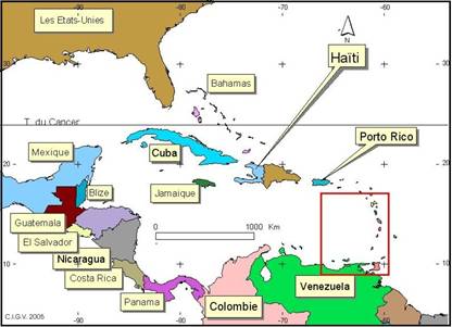 Je cherche vainement dans cet aéroport de San Juan des avions de compagnie portoricaine. Je ne vois que des avions de compagnie américaine, anglaise ou française. Il n’y a point de compagnie nationale d’aviation et pour cause ! Nous sommes ici, dans un pays appelé Etat libre associé aux Etats-Unis d’Amérique. Nous y reviendrons ! Mais où sommes nous donc dans ce dédale d’innombrables îles antillaises ? Entre l’océan Atlantique à l’Est et l’Amérique Centrale à l’Ouest, la mer des Caraïbes entoure les îles des Grandes et Petites Antilles !