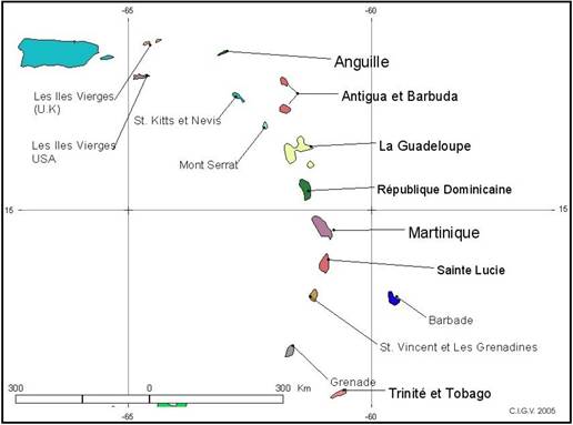 Revenons à nos Antilles! L’arc des Antilles qui s’étend du Sud de la Floride au Nord du Venezuela est divisé en deux parties, les Grandes et les Petites Antilles. Cuba la rouge, Haïti la belle, la voisine République Dominicaine, la Jamaïque et la présente Puerto Rico forment les Grandes Antilles. Ces cinq îles ont toutes une population comprise entre 2 millions (Jamaïque) et 10 millions d’habitants (Cuba). Au Sud des Grandes Antilles commence le défilé des dizaines d’îles et de milliers d’îlots des Petites Antilles, regroupés par zone d’occupation :